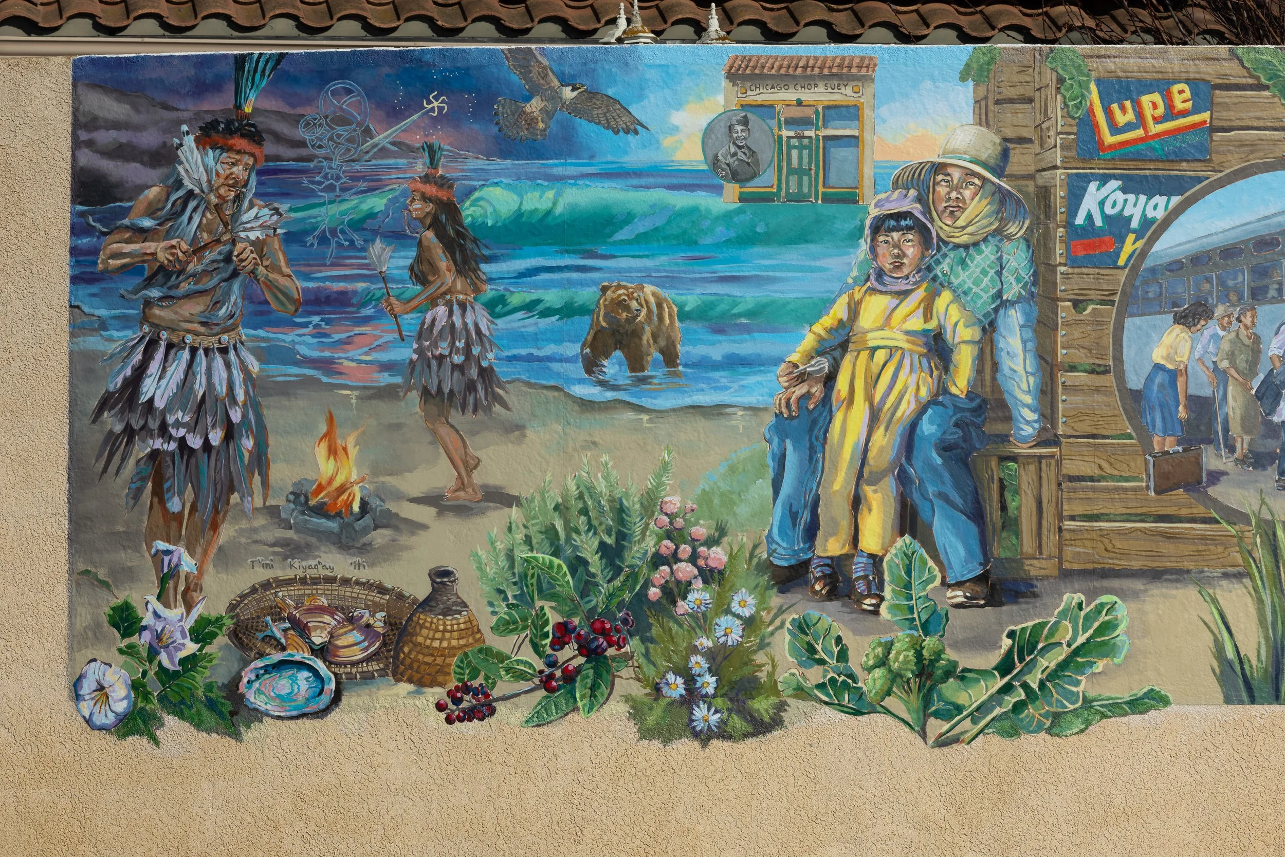 I started with the Chumash, whose village "Amuwun" was there first (though there were likely people before them). I decided to paint the Barracuda Dance and included an arborglyph—a tree carving that the local Guadalupe Chumash family was involved in discovering and interpreting. It's a sophisticated sundial and calendar of the equinoxes and solstices that correlates with the positions of Ursa Major. In the mural, I painted the positions of Ursa Major around Polaris (the North Star) and how it connects to the calendar in the arborglyph. Please watch this short video, Chumash Science Through Time, to get the full backstory on the arborglyph.